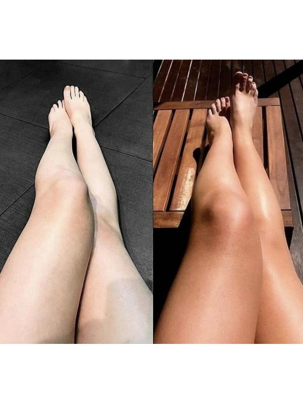 Une fois l’application corporelle terminée, glissez légèrement et mélangez la mousse sur le dos des mains, les poignets et le dessus des pieds. Évitez de projeter de l’eau sur une peau fraîchement bronzée.